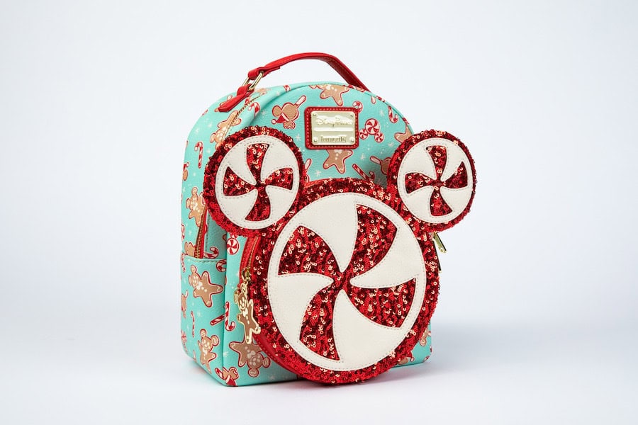 Loungefly will also get in on the fun with this precious Mickey Mouse Vintage Christmas Loungefly Mini Backpack that features an allover pattern of gingerbread cookies with Mickey ears, Mickey Ice Cream Bars with Santa hats, Mickey peppermints, candy canes, and snowflakes! The front pocket is a Mickey Peppermint with fabulous red sequins, and there is even a Mickey eared gingerbread cookie as the zipper pull!