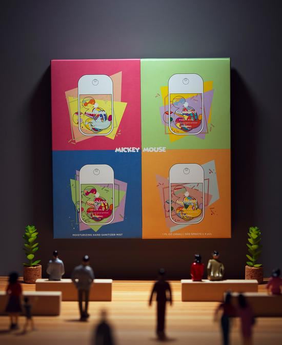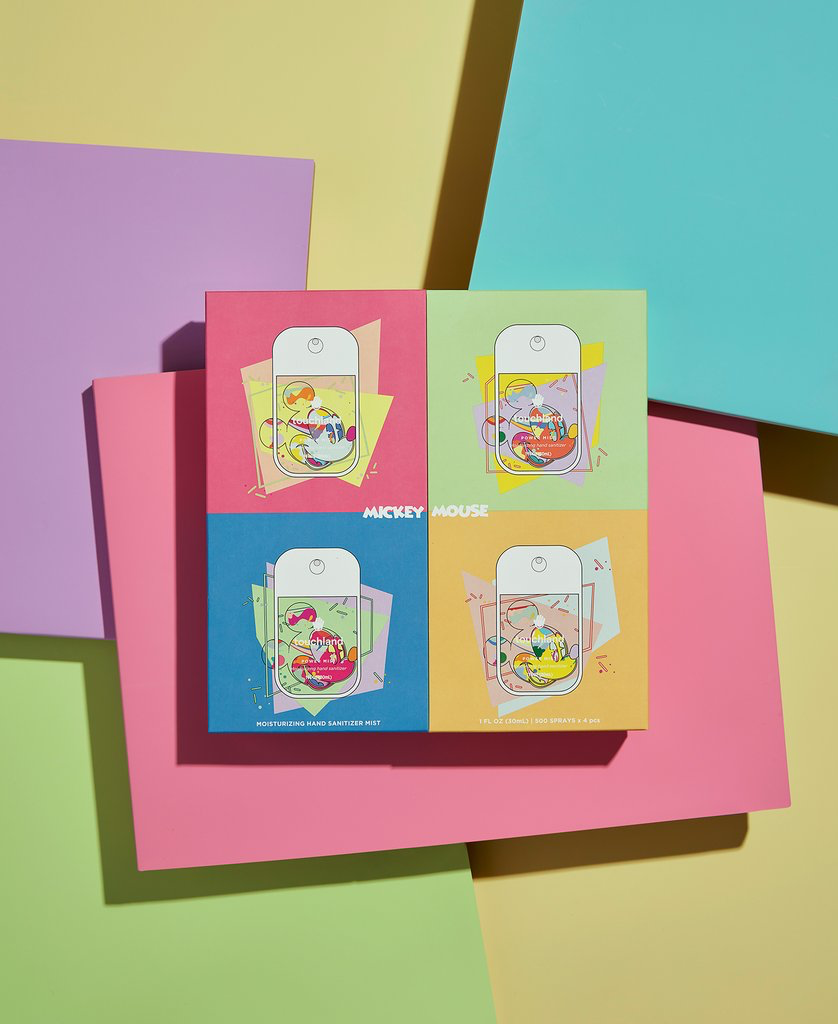 This collaboration is a four-piece limited edition set of Touchland’s fan-favorite Power Mist Moisturizing Hand Sanitizer scents! They are Aloe You, Pure Lavender, Citrus Grove, and Unscented! Each one includes a custom-designed pop art style Mickey Wallpaper sticker that shows through the bottle! The four sanitizers also come in a fabulous gift box with center sliding panels showing off the fabulous colorful pop art images! The box is practically a work of art in itself!