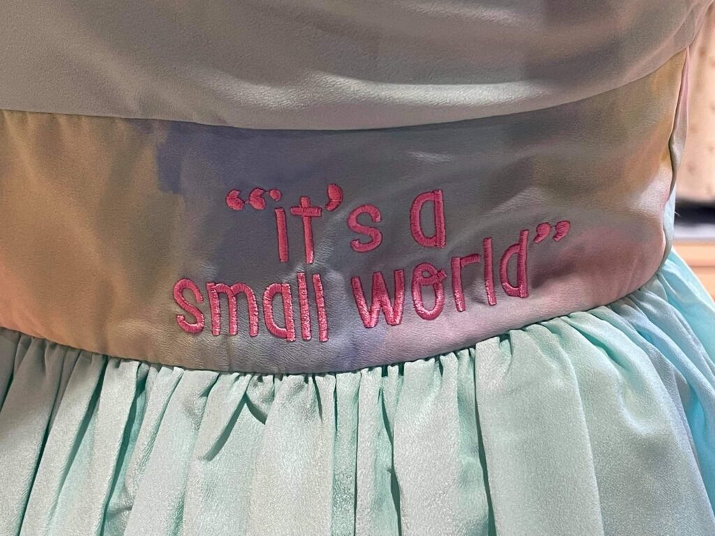 This fabulous light blue dress is so beautiful! It features a fun gathered strap neckline that adds some unique shape to the bodice and a scoop back that has major vintage flair. It looks like something straight out of old Hollywood! The wide waistband is a gorgeous pastel tie-dye with “it’s a small world” embroidered in pink on the side back of the waist! I love how the tie-dye is unique, so each piece is just a little different! Around the bottom of the skirt, you can spot outlines of buildings, flowers, characters, and even animals from the classic attraction!