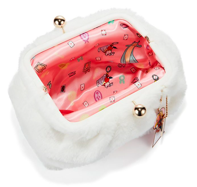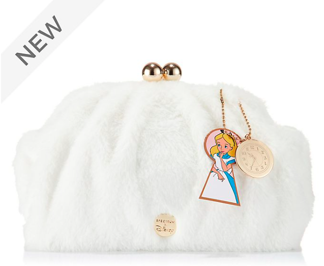 First up is this precious White Rabbit Makeup Clutch! It features a fluffy finish, a bunny tail, a golden pocket watch charm, an Alice in the key hole charm, and a pastel print interior lining featuring the White Rabbit! It even comes with an exclusive Alice in Wonderland dust bag! I think this little bag is cute enough to use as a regular clutch and would add some whimsy to a DisneyBound!