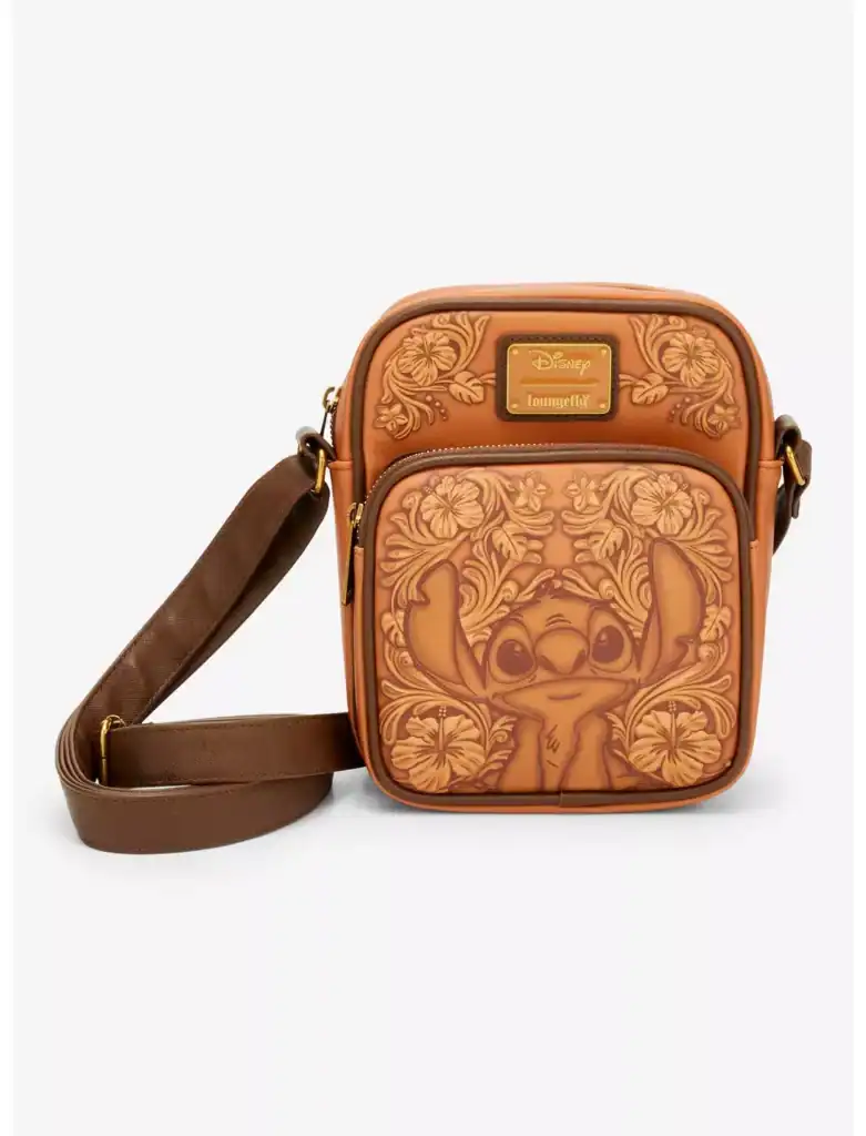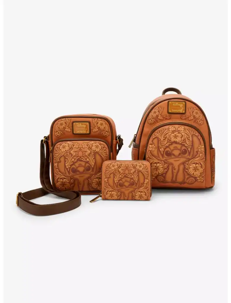 The collection includes three standout pieces. The first is this mini backpack. With its brown leather exterior and detailed etching, it looks like it just arrived from the tropics. Stitch even looks calm on the front. You would never guess that he was about to crash your summer party.
