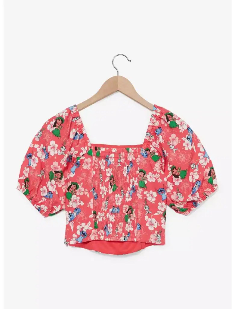 Say aloha to your new favorite top! This Lilo & Stitch crop top features the duo amid hibiscus details, paired with a smocked back panel for extra style.