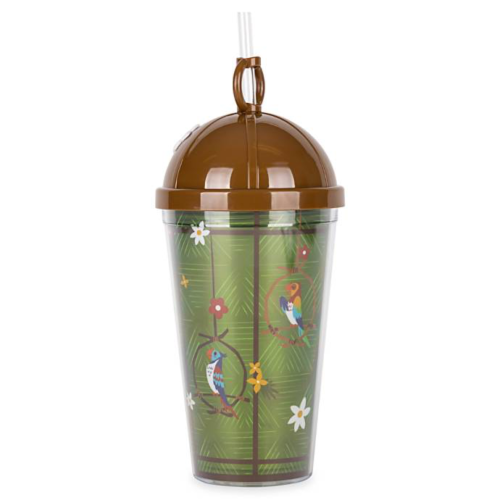 This precious acrylic tumbler is inspired by a bird perch with a fabulous little hang loop on top of the screw-on dome lid that the reusable straw actually goes through! The brown dome lid also features 3D flowers! You can spot a white flower, a red flower, and a yellow flower! Unfortunately, unlike those in Walt Disney’s Enchanted Tiki Room, these flowers don’t croon! The double-walled cup itself has a fabulous tiki textured green background with more flowers! The words “All The Birds Sing Words” are on the front of the tumbler in a yellow Tiki Room font. The back of the tumbler features our four favorite macaws–José, Michael, Pierre, and Fritz–on their perches!