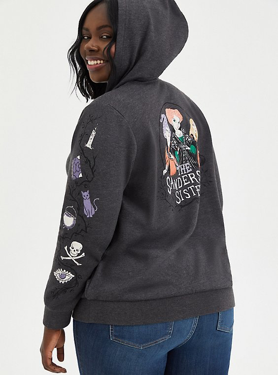 Next are more classic style outerwear pieces including this Lace-Up Hoodie that features “The Sanderson Sisters” on the back along with an image of the three witches, icons like the Black Flame Candle, a spellbook, Binx, a cauldron, a skull, and crossbones, and an eye on each of the sleeves, and lace-up detailing at the neckline.