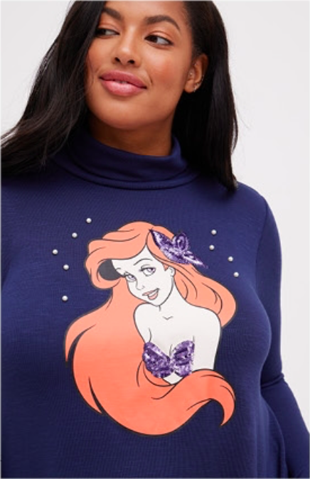 There is also an adorable Ariel turtleneck top featuring little pearl “bubbles” and shimmery glitter on her shell bikini top and hair flower! This piece is coming soon!