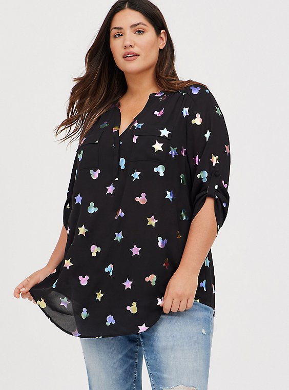Next is this fabulous black Tunic Blouse that features a colorful allover pattern of shiny iridescent Mickey icons and stars! The button rolled cuffs, pockets on the chest, and gathering at the shoulder add the finishing touches!