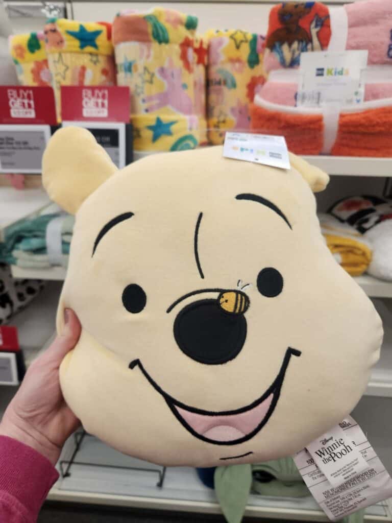 The standout piece has to be the oversized Winnie the Pooh face pillow. It’s shaped just like Pooh Bear’s smiling face, complete with his sweet expression and a tiny embroidered bee resting right on his nose.