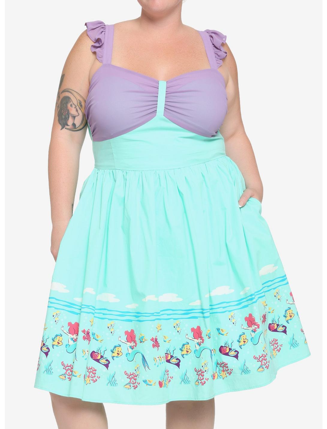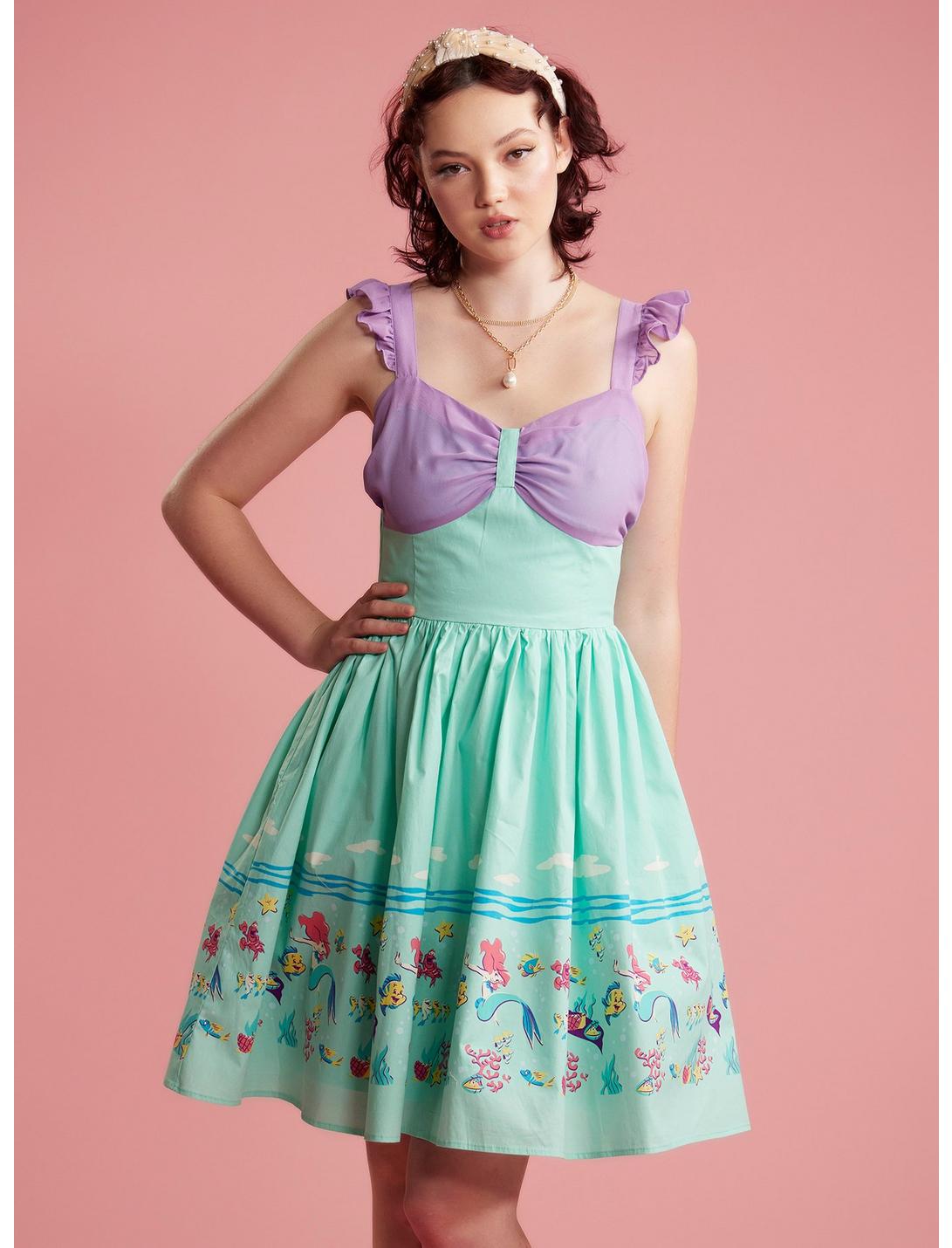 Get ready to add mermaid style to your summer rotation! This Ariel-inspired dress has me flipping my fins with joy! First, I absolutely love the bright pop of teal and purple in this design. The colors are so fun for warm weather adventures on dry land. The bottom of the skirt features an all-over pattern of Ariel, Sebastian, and Flounder as they swim through the ocean.
