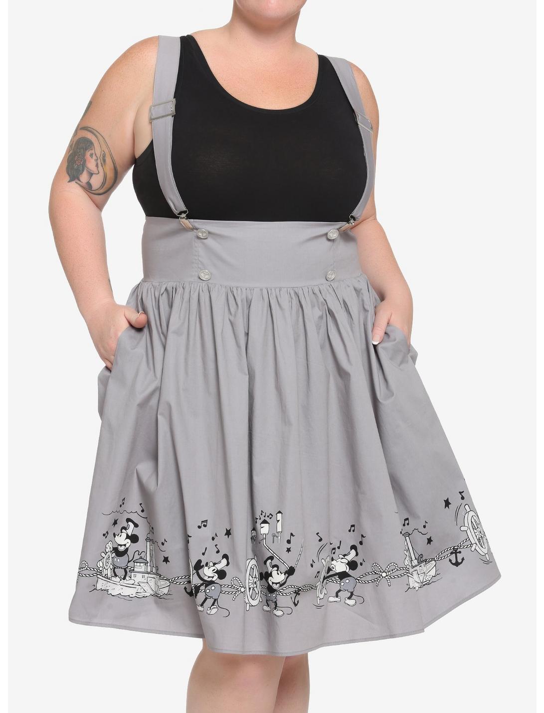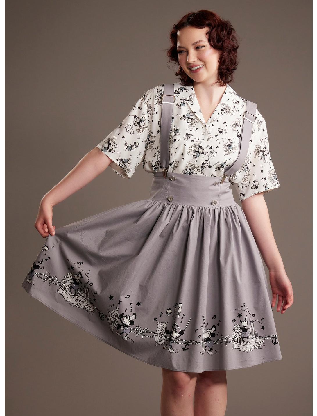 This Steamboat Willie collection from Her Universe is sure to have you whistling a happy little tune. Hop aboard the steamboat in style with this button-up shirt! Keep your outfit looking classy with this black & white Steamboat Willie woven top, featuring an allover print. Then, dress up in retro Disney fashion with this high-waisted Steamboat Willie suspender skirt, featuring Mickey Mouse at the helm printed along the skirt. It comes with 4 silver-tone anchor buttons on the waist, detachable and adjustable suspender straps and side pockets.