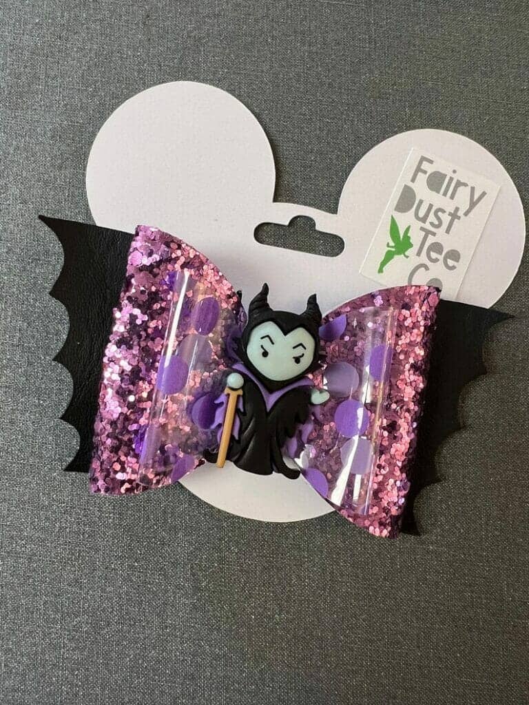The first villain bow is the Maleficent bow. Maleficent rules from on top of your head with her scepter in her hand. She stands in front of purple and black ribbon. The black ribbon looks a little bit like dragon wings, which goes along perfectly with the theme of the bow.