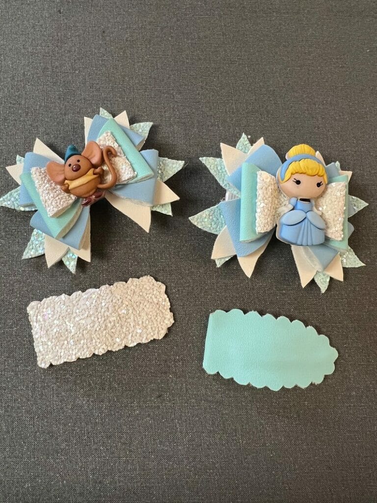 The second princess option is a set of four bows. Cinderella and Gus Gus look cute and they stand in front of Cinderella blue and white bows. The set also includes two, more subtle blue and white hair clips.