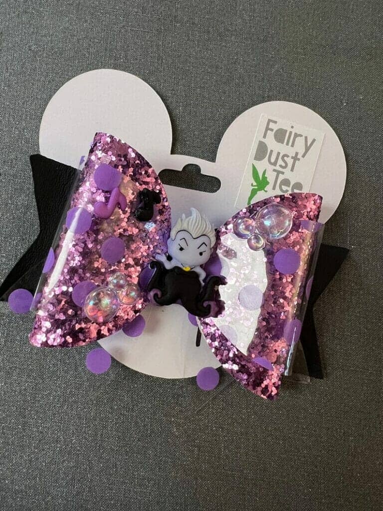 There is also an Ursula mermaid bow. One side of this bow is a sparkling mermaid tail, while musical notes float into the sea on the other side of the bow.