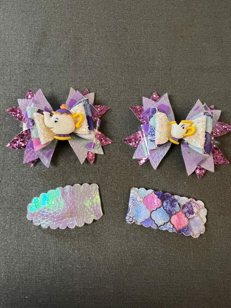 Finally, princesses do much better when they have the support of their loving sidekicks. Chip and Mrs. Potts have their time to shine in the final set of princess hair accessories. The duo both stand in front of sparkling ribbon that matches their white, pink, purple, and yellow color scheme. There are also two flashy hair clips in the set. One of the clips reminds me of the stained glass window from the movie.