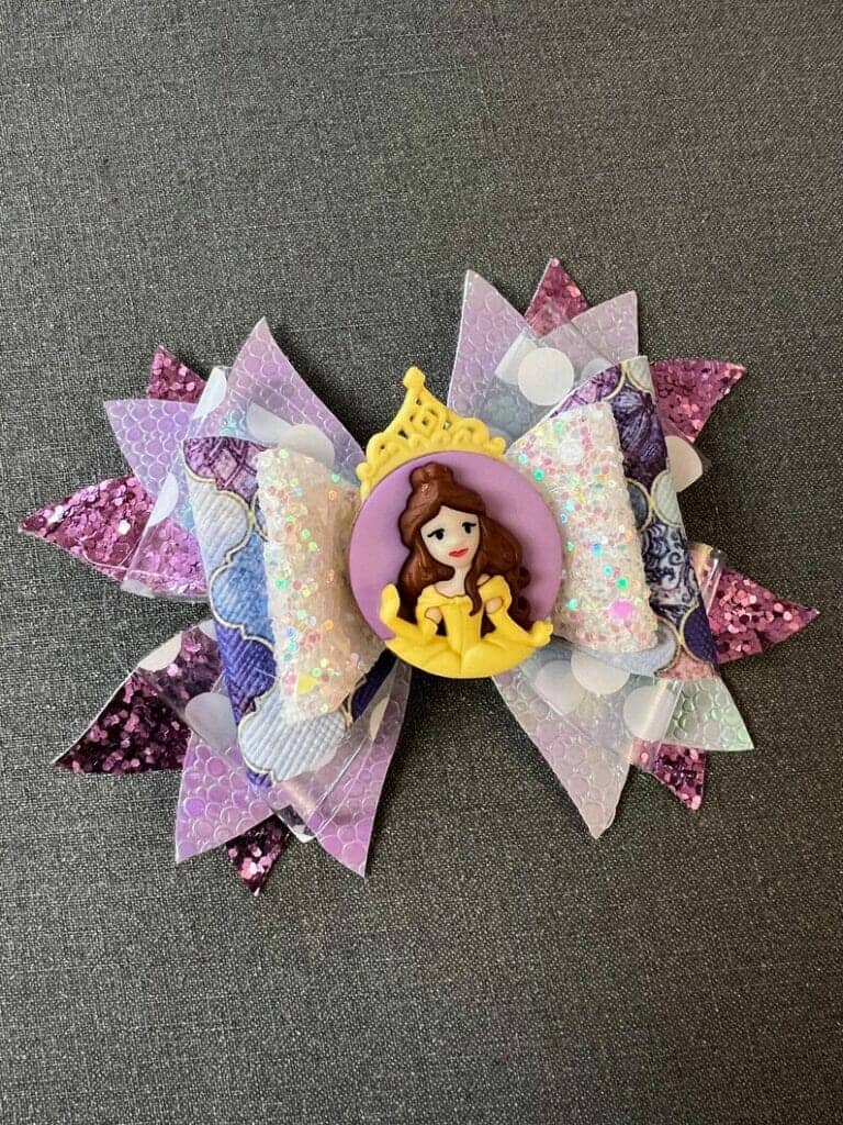 The first bows are all about the princesses. Belle stars on the first bow. She poses for her close-up, surrounded by glitter and sparkling fabric. She even has a rather large tiara above her head.