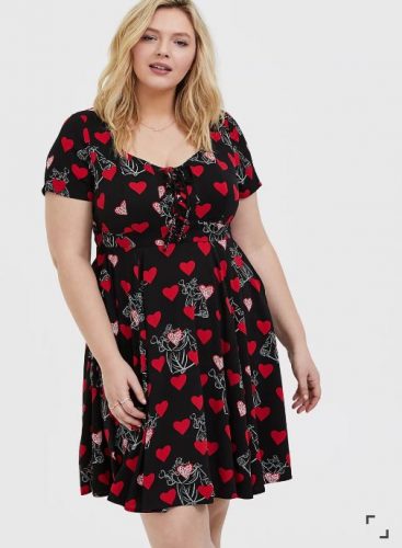 I’m going to start things off with the dress that gave everyone at Disney Fashionista heart eyes. The Queen of Hearts Black Lattice Skater Dress is perfect for your Valentine’s Day date night plans! This dress is fit for a queen, the queen of hearts that is. This dress features an Alice in Wonderland print and a lace-up center that adds interest and fashionable appeal.