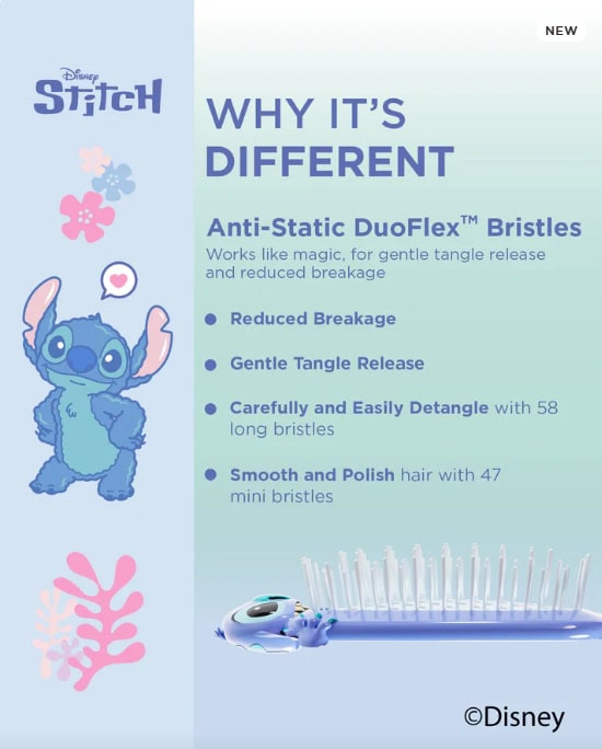 Unbrush is a hugely popular detangling hairbrush. Designed to glide through wet or dry hair with minimal breakage and pulling, it’s a favorite of the Fashionistas and hairstylists alike. This special edition is patterned after Stitch, with a playful cornflower blue design that looks as if the mischievous little alien is trying to eat it! He may have taken a nibble, too, because the brush is streamlined to approximately 9″ tall by 1″ deep. Though it’s slim in profile, it still packs in over 45 bristles to help smooth and polish your hair to perfection.