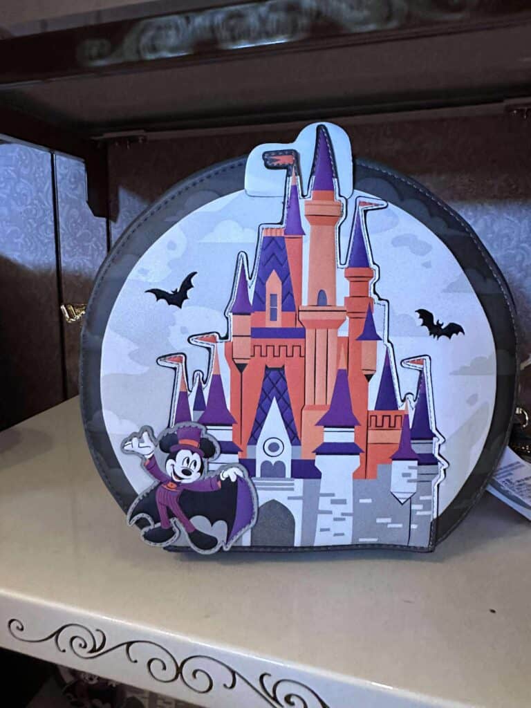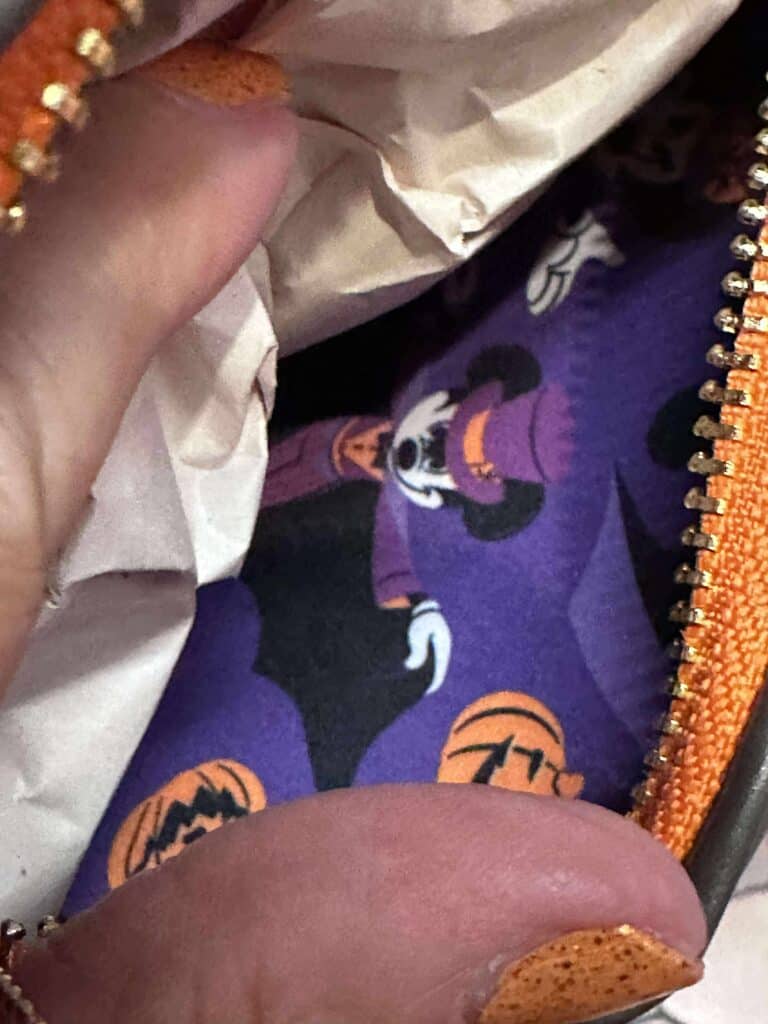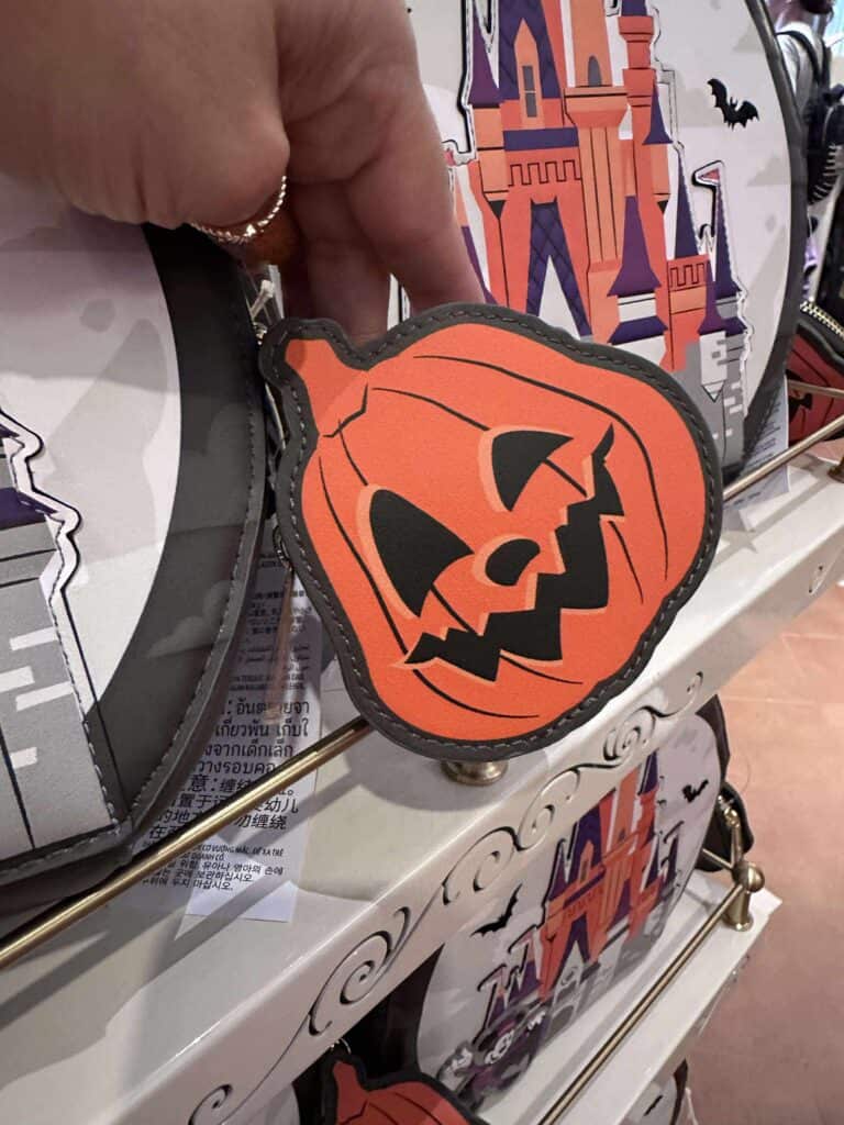 Dracula Mickey is the star of the party Loungefly. He can be found on the front cover and inside on the lining of the circular bag. With “Boo to you” imprinted on the straps, you’ll be representing the party all spooky season long. Enjoy a sinister looking jack o’ lantern coin bag for all your loose items.