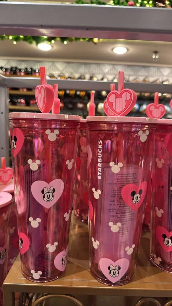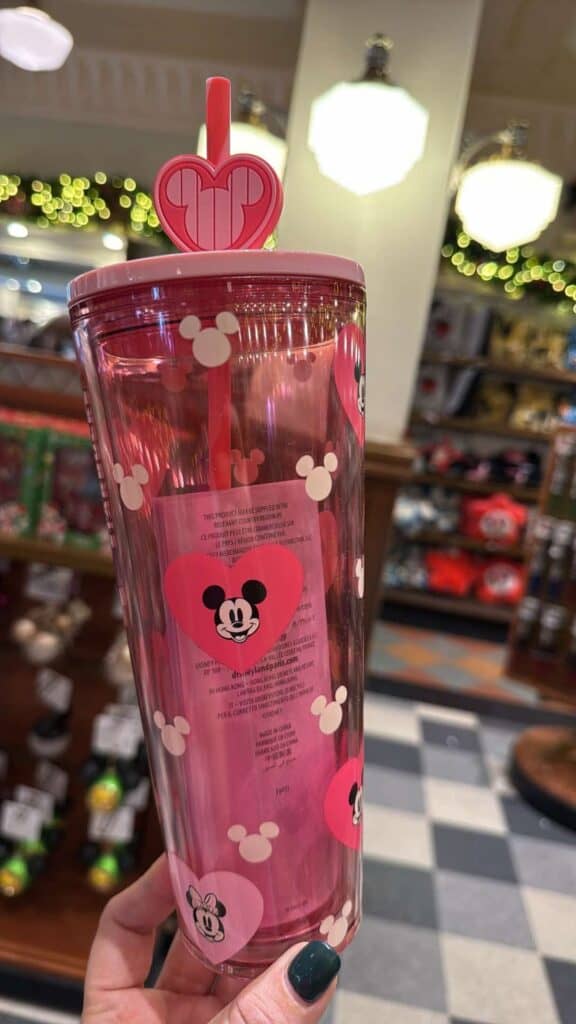 Show some love to St. Valentine’s Day with a pretty in pink tumbler. Mickey and Minnie’s loving faces can be found scattered inside hearts amid Mickey head icons. The tumbler is topped with a pink lid and heart adorned straw.