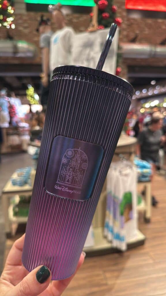 No new tumblers have appeared on the Disney Store website, but new designs are pouring into the parks! The first is a purple ombre cup that demands royal respect. A design window features Cinderella Castle amid fireworks celebrations with Walt Disney World beneath. Vertical grooves offer an extra depth to the tumbler.