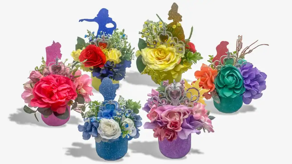 There are 6 regal options to choose from. The first option is the Ariel arrangement. This bouquet includes a silhouette of Ariel and three flowers that match Ariel’s hair, tail, and top. It also includes a bit of seagrass and, of course, a tiara.