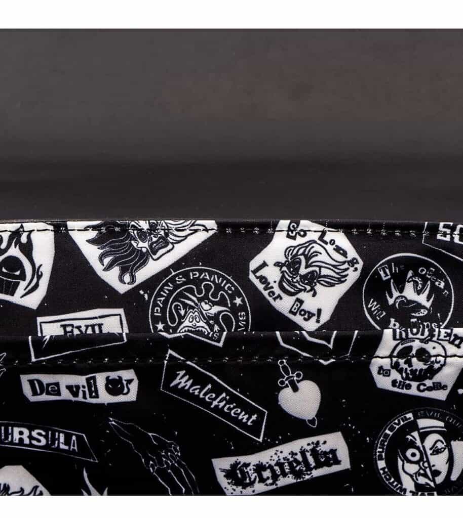 Polaroids of the evil geniuses can be found scattered across the surface of the bag. The best part is that they’re not necessarily pics from their movie but pics of them together, as if they partied together. Funny face shots of Ursula, Hades, and Cruella are mixed in with snaps of Ursula whispering in Maleficent’s ear. See Hades pinching the cheeks (?) of Scar! For this reason alone, the bag is worth the price!