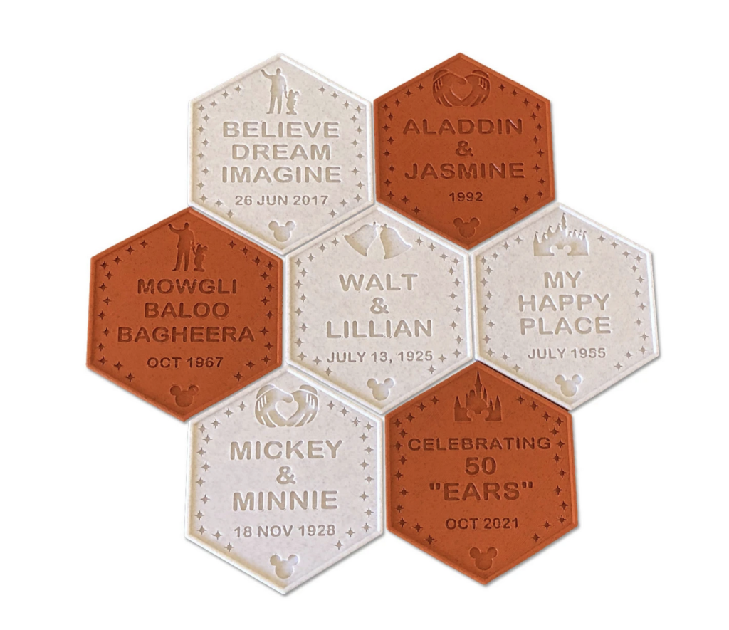 These replica coasters look exactly like the bricks that welcomed guests into the Magic Kingdom. You can choose to order them in either Straw Filament, which is a light, sandy tone, or Red Brick Filament, which is the more typical, red brick color. You can also choose from several designs on the top of the coasters, including bells, a Mickey Head, a castle, or Walt and Mickey holding hands. Little stars shimmer on the side of each brick no matter what design you choose! There is also a small mouse head at the bottom of each brick.