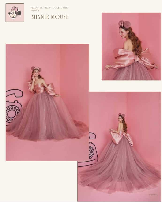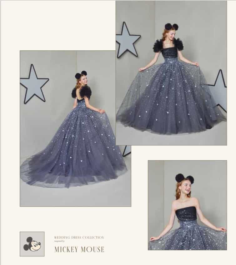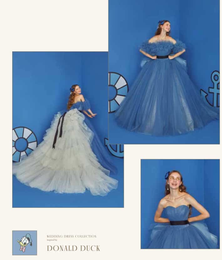 The collection includes more than just a pretty face. Mickey and Minnie make a formal statement with grand gowns. You can see the versatility of Kuraudia’s collection with the various characters portrayed. Minnie’s rose gold gown’s main feature is her iconic bow found on the back. Both members of the couple are showcased with corresponding pink and blue dresses. Layers of tulle flow while gold outlines of Mickey heads and Minnie bows prevail.