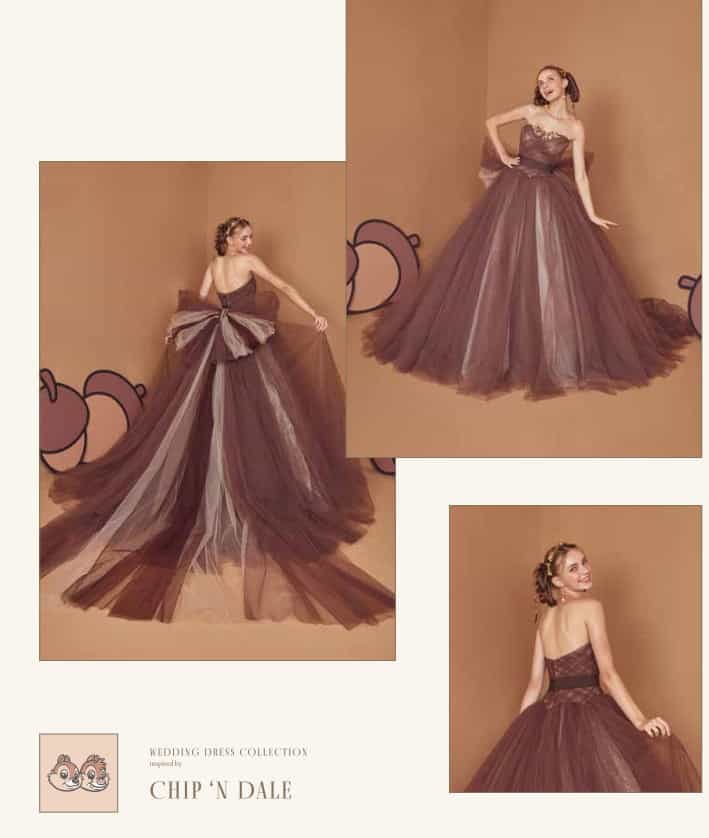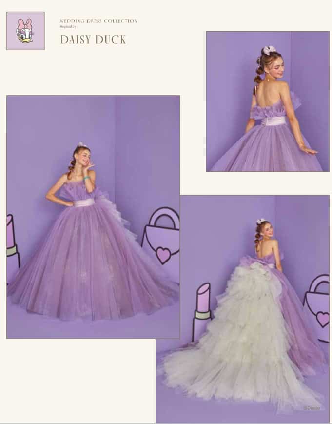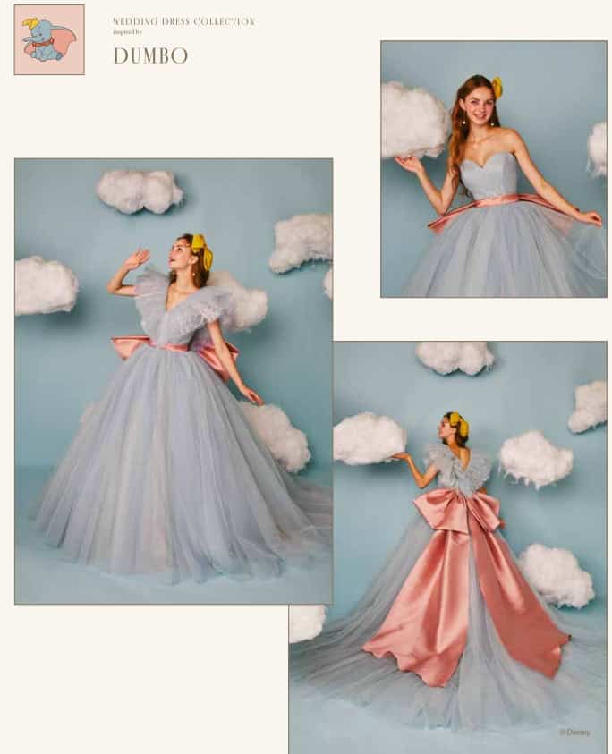 It’s truly difficult to describe these magnificent gowns without ending every sentence with an exclamation mark. Kuraudia even gave a nod to friends of Mickey in the form of Donald, Daisy, Chip N Dale, and Dumbo. With cascading white tulle and loose black ribbon, the first dress is a ringer for Mickey’s BFF Donald. Of course, Donald’s sassy lady Daisy gets her due in a matching purple and white dress with a pink ribbon belt. The devil is in the details and this time the devil is the mischievous chipmunks Chip N Dale. I love that these buddies are getting a nod! I’m simply nuts over the criss-cross design of the bodice and two-tone colors of the skirt. Believe you can soar! Dancing around the ballroom in a dress like this, I’m sure my feet would never touch the floor. Fashioned after everyone’s favorite pachyderm, just add your own feather and faith.