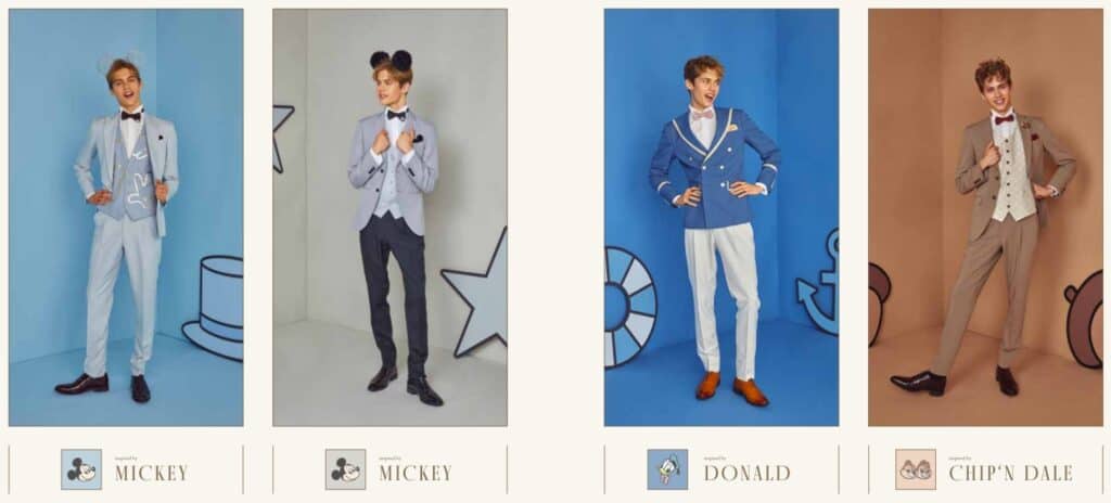 The men are sure to look dapper in the corresponding tuxedos from the same collection. From the suit based on Timothy to Donald Duck and Chip N Dale. Lastly, tie up the look black tie bounding with one of two Mickey Mouse Tuxedo.