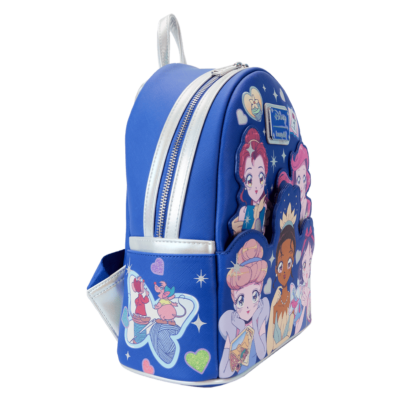 In addition to the All Over Print Bags, there are also three other Manga Style items. The first is this Manga Style Mini Backpack. I fell in love with the bag from the moment I saw it. Cinderella, Ariel, Snow White, Tiana, and Belle all stare out at you intently. It looks like they are very interested in whatever story you are about to share with them. Stars and hearts sparkle around them. Like with the All Over Print Bags, we see little items that represent all of the princesses floating around them. There is the Dwarfs’ cabin, which is in a little diamond frame. There’s also Cinderella’s glass slipper, the enchanted rose, one of Tiana’s cupcakes, and some of Ariel’s hidden treasures.