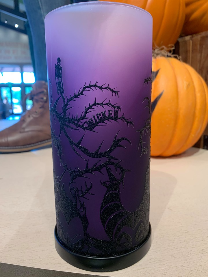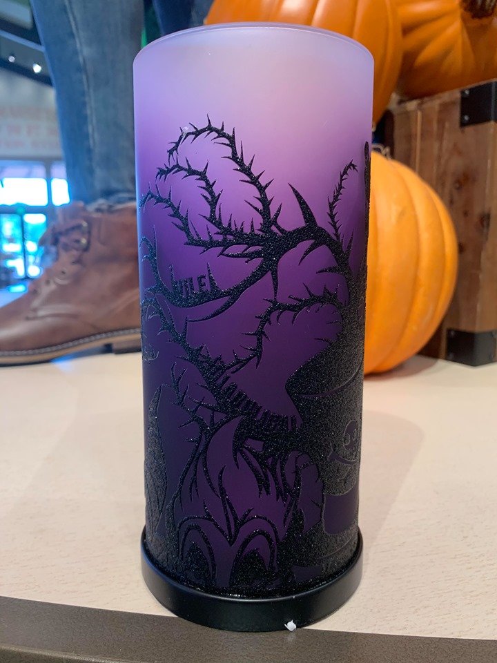 Another impressive piece is the villainous purple luminary. This is a battery-operated candle, with a gorgeously gloomy purple ombre. A sparkling black silhouette creeps around the candle, with images of Dr. Facilier, Ursula, and Maleficent.