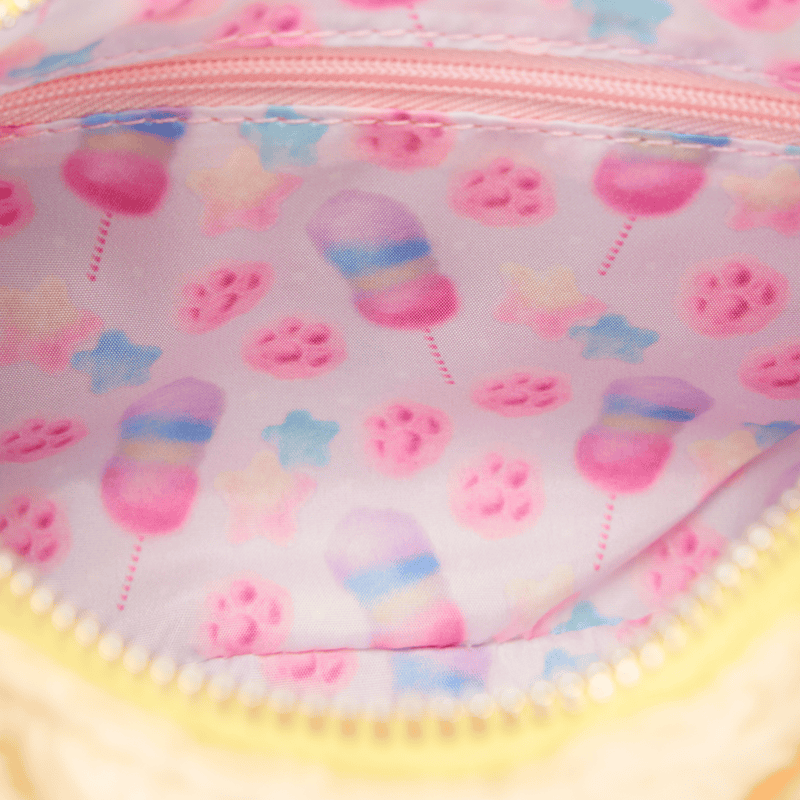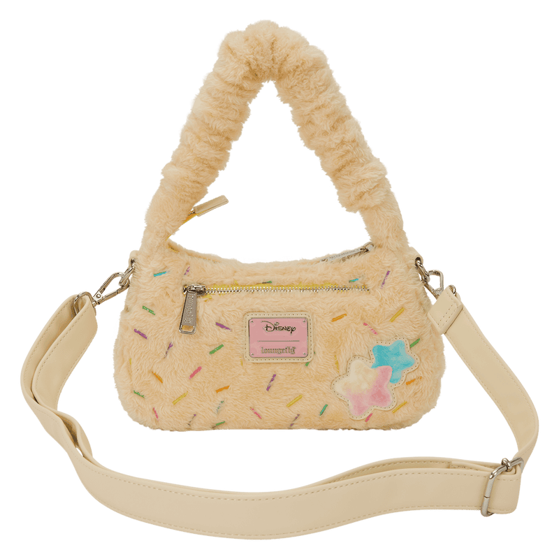 Officer Clawhauser represents on the small fuzzy crossbody bag. Offering two handles, one like a scrunchie, and the other a matching shoulder strap. Carry this cotton candy-infused sweet around in comfort. Fur lines the bag to insinuate sugary fluffiness. Discover more boughs of cotton candy lining the interior.