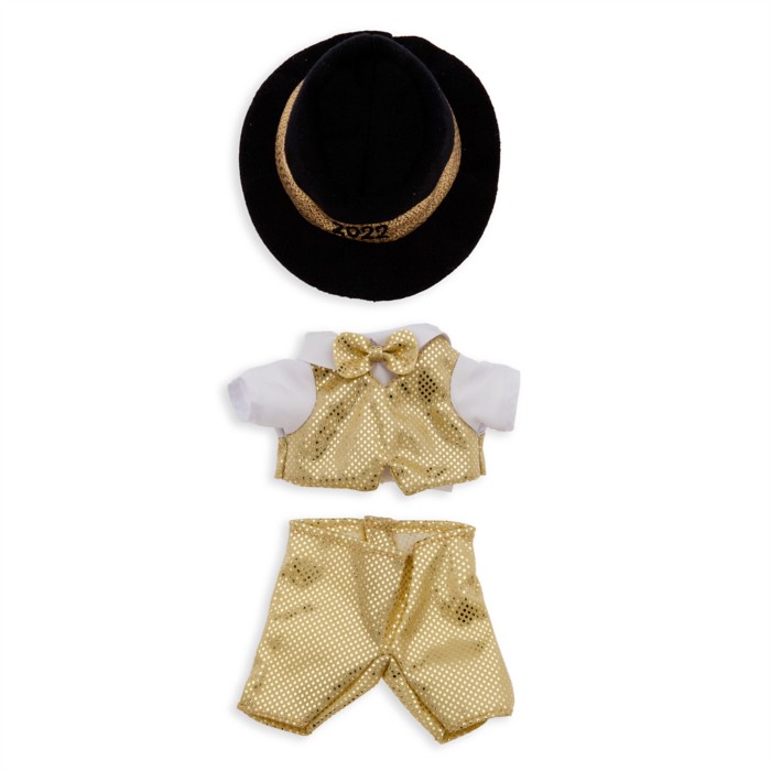 Last, but certainly not least, is this precious metallic suit that includes a metallic gold sequin vest with an attached white shirt and metallic gold sequin bow tie, matching metallic gold sequin pants, and a black hat with a metallic gold band featuring “2022!”