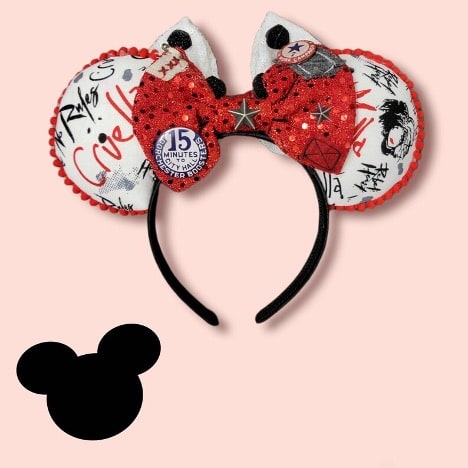 The first option are the Cruella Ears. One side of the ears has images and items from the 2021 Cruella movie! Our fearless fashionista leader, Michelle, will definitely be needing this pair!